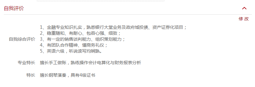 同時也是因為很多學生沒有正規的實習只有一些零散的兼職活動,這里的話就盡量寫和同學所報銀行崗位相關的一些兼職經歷,描述過程中注意用詞盡量用數據和技能說話。
