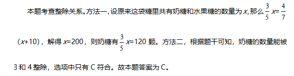 解析:本題考查奇偶特性。設(shè)做對題目的數(shù)量是x,不做或做錯的數(shù)量是y,則有x+y=50。由和差同奇偶可知,x-y=偶數(shù),即答對題數(shù)和答錯題數(shù)(包括不做)相差的數(shù)量是偶數(shù)。故本題答案為D。