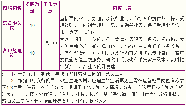 中國(guó)光大銀行銀川分行是總行設(shè)立的第38家一級(jí)分行,于2014年8月啟動(dòng)籌備工作,2015年11月19日試營(yíng)業(yè), 2016年5月13日正式開(kāi)業(yè)。銀川分行成立以來(lái),始終秉承“以客戶(hù)為中心,以市場(chǎng)為導(dǎo)向”的經(jīng)營(yíng)理念,團(tuán)結(jié)奮進(jìn),銳意進(jìn)取,不斷優(yōu)化服務(wù),各項(xiàng)業(yè)務(wù)保持著快速穩(wěn)健的發(fā)展勢(shì)頭。中國(guó)光大銀行銀川分行將致力于打造“有為才有位,有位須有為,無(wú)為即無(wú)位”的選人、用人、育人環(huán)境,堅(jiān)持“業(yè)績(jī)用人,品德用人,德才兼?zhèn)洌缘聻橄?rdquo;的標(biāo)準(zhǔn),堅(jiān)持公平、公正的選拔任用機(jī)制,為您打造良好的職業(yè)成長(zhǎng)平臺(tái)。熱忱歡迎廣大優(yōu)秀畢業(yè)生能加盟到中國(guó)光大銀行銀川分行的團(tuán)隊(duì)中來(lái),施展您的才華,光大與您共精彩!