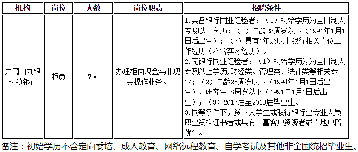 2019年井岡山九銀村鎮銀行社會招聘公告