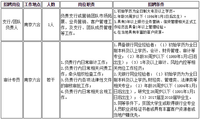 南京六合九銀村鎮銀行為中國小企業金融服務領先銀行—九江銀行主發起設立,南京市六合區知名企業等共同出資設立的新型農村金融機構,于2011年12月開業,下設營業部、大廠支行、金牛湖支行3個營業網點。南京六合九銀村鎮銀行自成立以來立足“三農”,深入基層,深入農村,要在六合這塊熱土中生根發芽。因團隊建設和業務發展需要,現誠邀有志于金融事業的優秀人才加入,我們將為您提供具有競爭力的薪酬待遇、廣闊的職業發展空間和卓越向前的企業文化,與您共創美好未來!