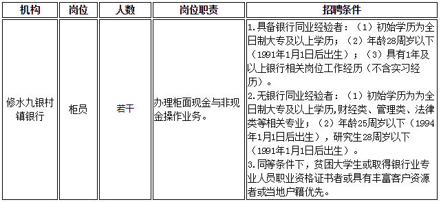 2019年修水九銀村鎮(zhèn)銀行社會(huì)招聘公告