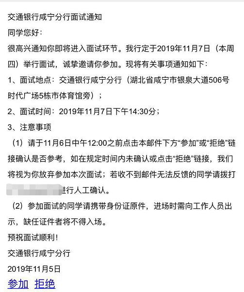 [湖北]2020年交通銀行咸寧分行校園招聘面試通知