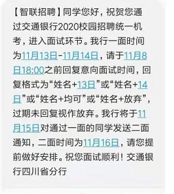 2020年交通銀行四川分行校園招聘一面面試通知公告