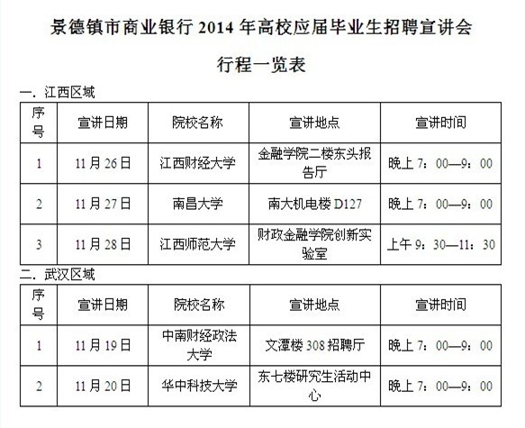 報名截止時間為2013年11月30日,期間我行將赴相關院校進行現場宣講,宣講會行程表及時關注閱景德鎮市商業銀行網站相關信息。