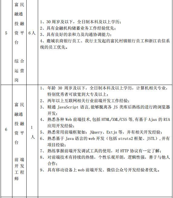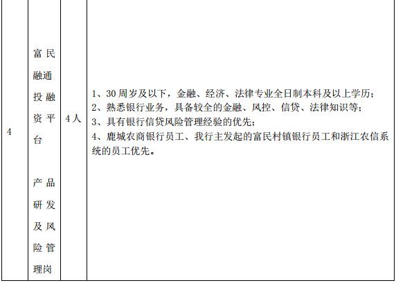 浙江溫州鹿城農(nóng)村商業(yè)銀行股份有限公司是一家經(jīng)中國銀監(jiān)會批準(zhǔn),在原鹿城農(nóng)村合作銀行的基礎(chǔ)上改制而成的股份制商業(yè)銀行。目前,全行擁有營業(yè)網(wǎng)點52家,在崗員工800多人,全行堅持“做小、做廣、做精”的經(jīng)營理念,加快經(jīng)營轉(zhuǎn)型,進(jìn)一步傳承發(fā)揚“普惠金融進(jìn)萬家”的農(nóng)信文化,并于今年推出溫州首家銀行系互聯(lián)網(wǎng)投融資平臺---“富民融通投融資平臺”,為客戶打造出一個新穎、便捷、安全的網(wǎng)絡(luò)理財投資平臺,實現(xiàn)財富增值。因業(yè)務(wù)發(fā)展需要,現(xiàn)面向社會公開招聘優(yōu)秀人才若干名。