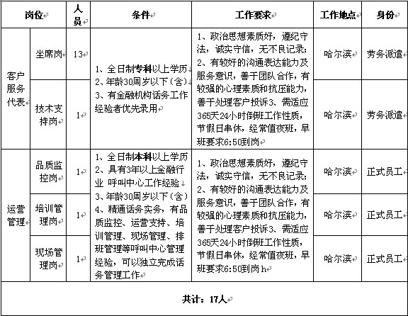 2、應聘客戶服務代表的人員一經錄用,將參與我行集中培訓,并進行不超過6個月的試用期,經考評合格者,簽訂勞務派遣合同,人事關系由黑龍江申龍物業管理有限公司管理。試用期經考評不合格者,將終止試用期
