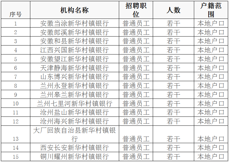 2019年上半年安徽當(dāng)涂等十五家新華村鎮(zhèn)銀行普通員工招聘公告