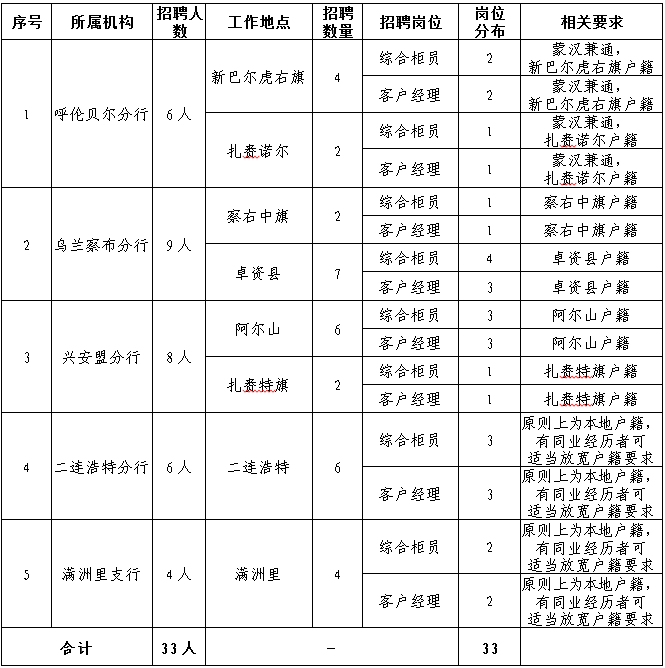 興安盟分行8人,二連浩特分行6人,滿洲里支行4人,具體招聘崗位及工作地點見下表。