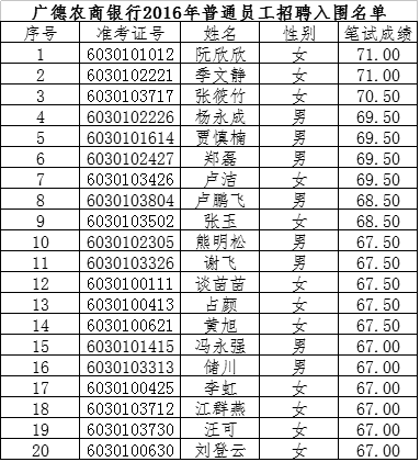 廣德農村商業銀行2016年度員工招聘筆試成績已由省聯社下發。根據《廣德農村商業銀行2016年員工招聘公告》,我行按1:1.5的比例,以筆試成績從高分到低分確定了普通員工面試入圍人員;省聯社按1:1.5的比例確定了計算機專業員工面試入圍人員。現將面試相關事項通知如下: