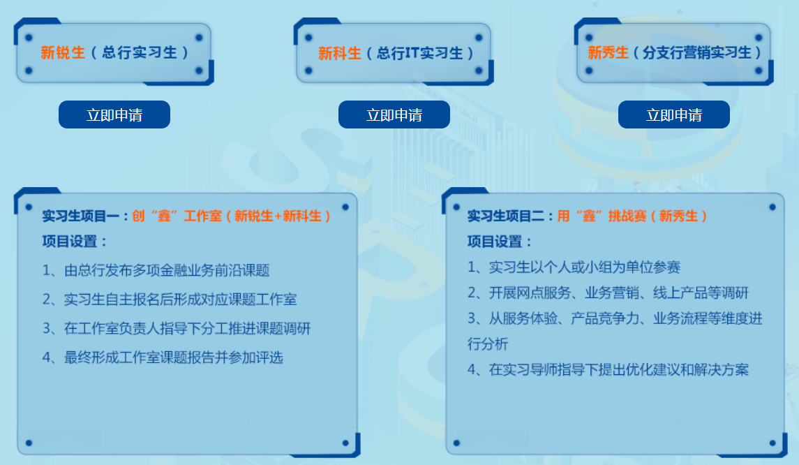 校園招聘職位所產生的任何損失,我行不承擔任何法律責任。對于任何第三人發布虛假招聘信息等非法活動,上海農商銀行保留追究其法律責任的權利。如有疑問,可與我行聯系,聯系方式:021-61899999轉校園招聘。