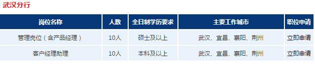 2、總行“管理培訓生”由總行直接招錄,培養方向為中高級管理人才。