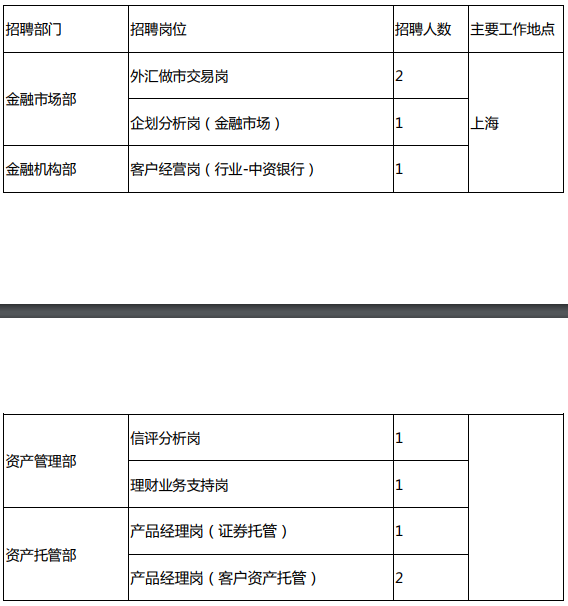 應聘條件:35周歲以下;金融學、管理學、經濟學、法律等專業全日制本科及以上學歷;3年以上金融行業從業經歷;具有較強的市場營銷和金融產品設計能力;熟悉私募基金、信托、互聯網金融及各類客戶資金等托管產品的某一領域或多個領域;具備一定的英語聽讀寫說能力。
