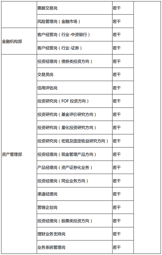 應聘條件:35 周歲以下;全日制碩士及以上學歷;5 年以上金融行業從業經驗;有應收賬款、房地產或資產證券化實際運作經驗者優先;具有金融機構資金部、產品部、審批部或券商資管工作經驗者優先;具有 CFA、CPA、FRM、證券從業資格者優先。