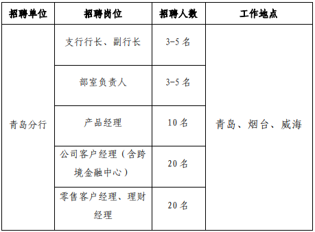 威海三地,共設(shè)有 32家經(jīng)營機構(gòu)。開業(yè) 16 年來,青島分行始終秉承“篤守誠信、創(chuàng)造卓越”的核心價值觀,認(rèn)真貫徹總行發(fā)展戰(zhàn)略,積極參與地方經(jīng)濟建設(shè),各項業(yè)務(wù)持續(xù)健康發(fā)展,贏得了社會各界和廣大客戶的良好口碑。現(xiàn)根據(jù)業(yè)務(wù)發(fā)展和經(jīng)營管理的需要, 廣納天下英才,共赴錦繡前程!