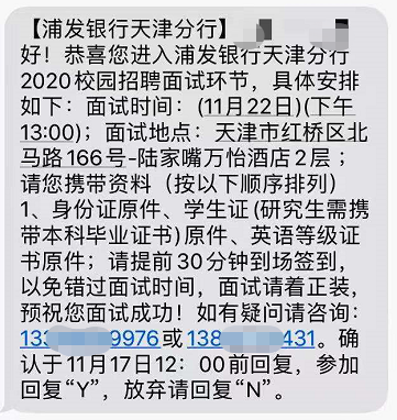 [天津]2020年浦發銀行天津分行秋季校園招聘面試通知