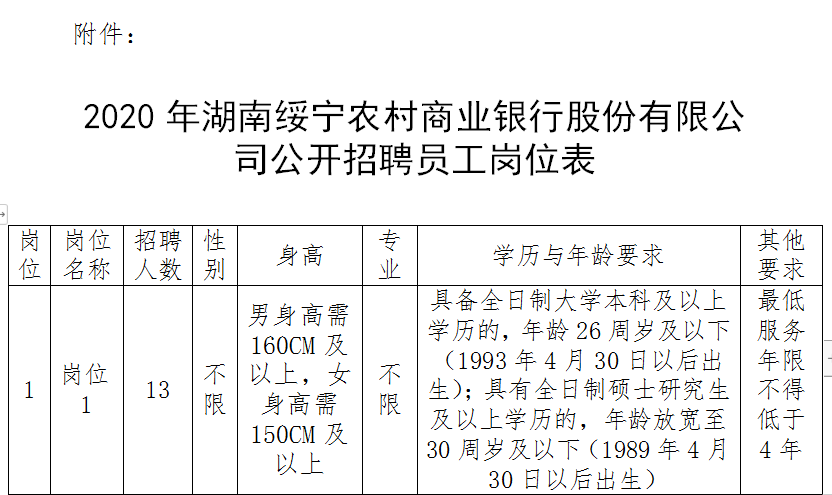 附件:《2020年湖南綏寧農村商業銀行股份有限公司公開招聘員工崗位表》