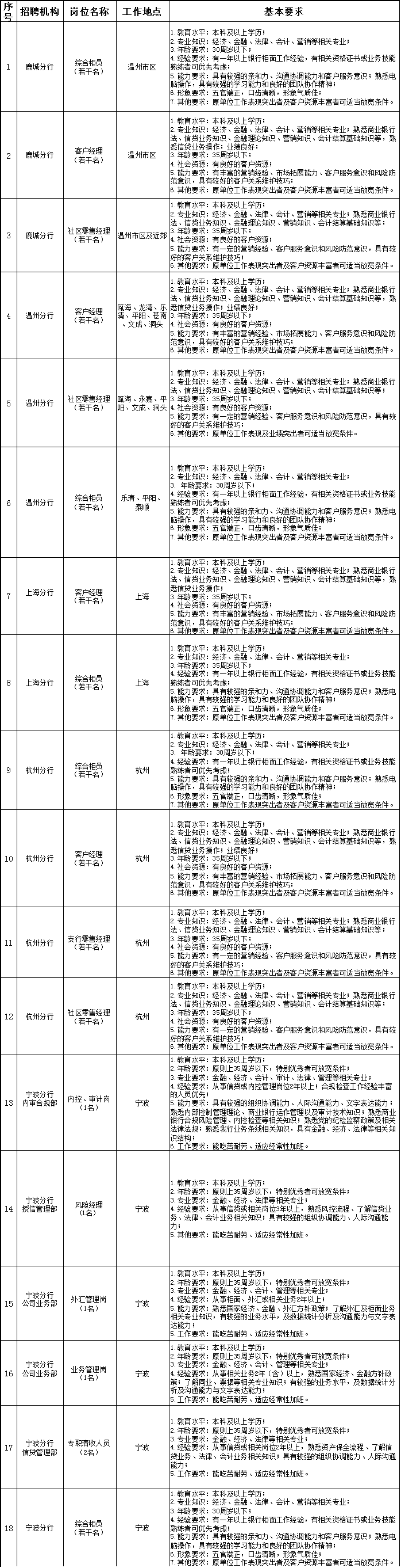 現(xiàn)根據(jù)工作需要,溫州銀行部分職位面向社會(huì)公開招聘。具體情況如下: