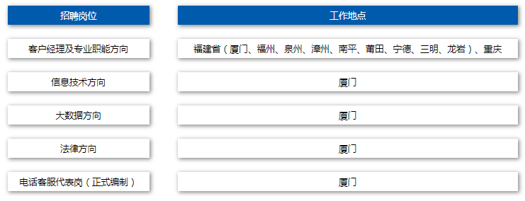 工作地點(diǎn):福建省(廈門、福州、泉州、漳州、南平、莆田、寧德、三明、龍巖)、重慶
