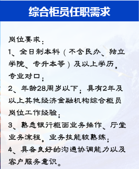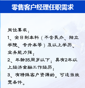 銀行招聘網(m.8b1u.cn)溫馨提示:凡告知“加qq聯系、無需任何條件、工作地點不限”,收取服裝費、押金、報名費等各種費用的信息均有欺詐嫌疑,請保持警惕。