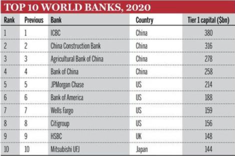 2020年7月1日,全球銀行業權威雜志英國《銀行家》(The Banker)年公布世界銀行1000強排名,中國建設銀行位列第二名。該排名基于一級資本,此為衡量銀行實力的關鍵指標。