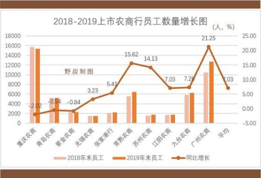 其中,2019年末員工最多的是重慶農(nóng)商銀行15371人,同比增長-2.02%:最少的是無錫農(nóng)商銀行1501人,同比增長3.23%。2019年員工增長絕對(duì)數(shù)和增長幅度最大的均為廣州農(nóng)商銀行,年末員工12668人,比上年同期增加2220人,同比增長21.25%(相關(guān)詳情見本文附圖二),似乎是為回歸A股在增加人力資本。