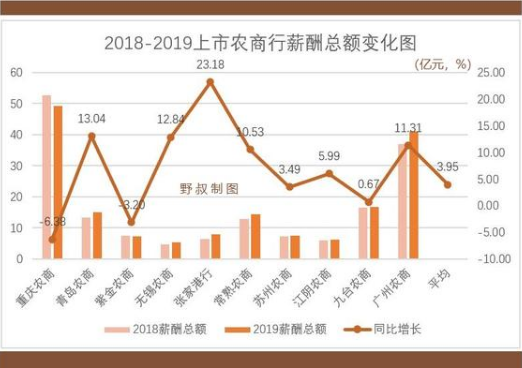 與2019年度6家國有大行全員平均薪酬28.94萬元相比,上市農(nóng)商銀行的反而更高;但是,當(dāng)年上市農(nóng)商銀行整體的平均薪酬是下降的,而6家國有大行整體的平均薪酬同比增長6.36%。