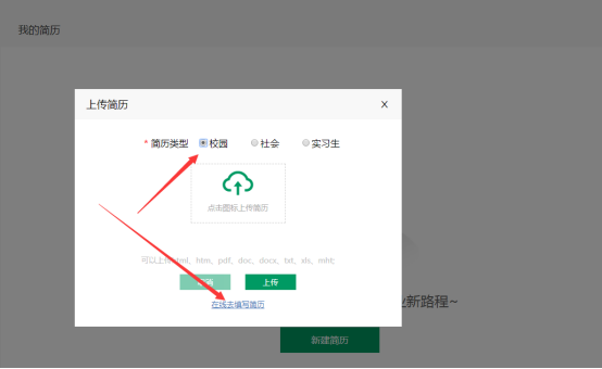 注冊完信息后簡歷類型選擇“校園”;然后選擇“在線填寫簡歷”。