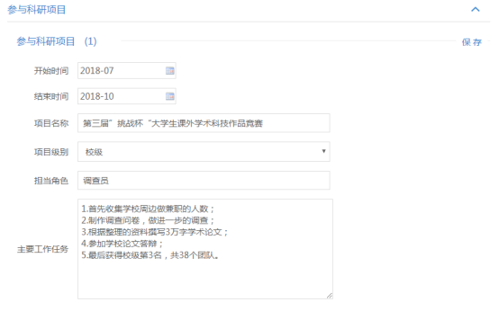 科研項目的話大家就比較少了,本碩可能很多專業都接觸的不多,那么這里空著好像空的太多也不是事,這時就可以把一些自己參與的其他項目填上去,像調研活動、科學實驗、模擬創業炒股等一些比賽都可以填寫。