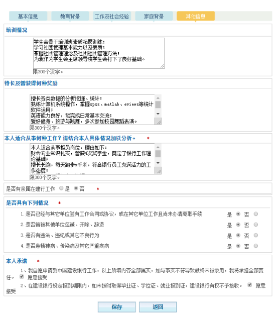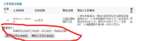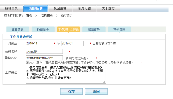 同時也是因為很多學生沒有正規的實習只有一些零散的兼職活動,這里的話就盡量寫和同學所報銀行崗位相關的一些兼職經歷,描述過程中注意用詞盡量用數據和技能說話。