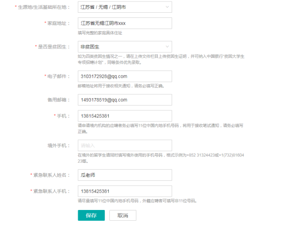 是否是貧困生:實際填寫即可。如為四類貧困生情況之一,請在上傳文件欄目上傳貧困生證明,并可納入中國銀行“貧困大學生專項招聘計劃”,同等條件優先錄取。