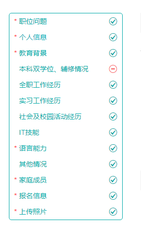 點擊預覽簡歷左邊顯示這個圖,如果沒有達對號的就是沒有保存的或者沒有填寫的。