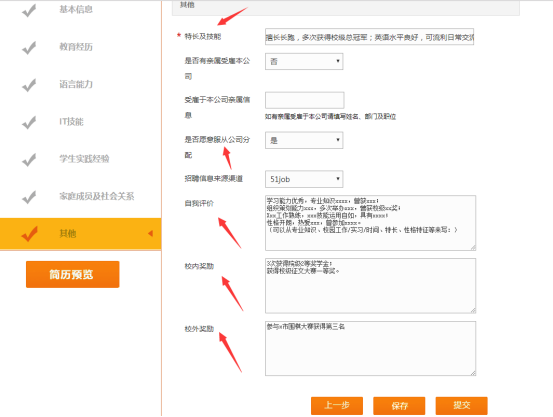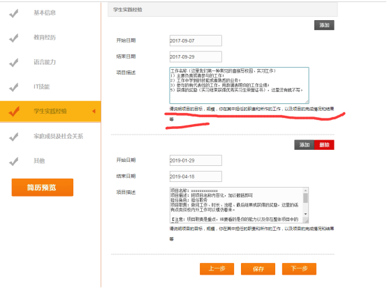 這里我主要寫了2種,一種是校園工作和實習/實踐,另一種是項目經歷;因為很多人看到“項目描述”以為沒有項目這里就直接空著了,這里沒有強制性要求的,符合的都可以往上填寫。