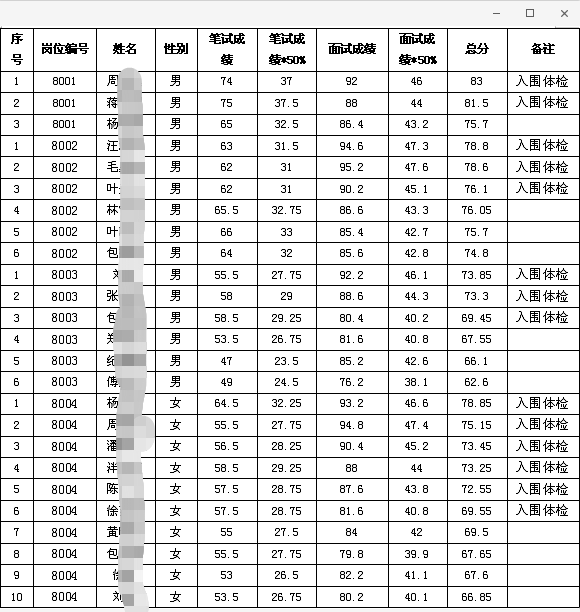 松陽農商銀行2020年公開招聘新員工結構化面試已于2020年5月16日結束,成績揭曉。根據《松陽農商銀行2020年員工招聘公告》相關規定,現將招聘成績及入圍體檢人員名單予以公示,具體事項如下: