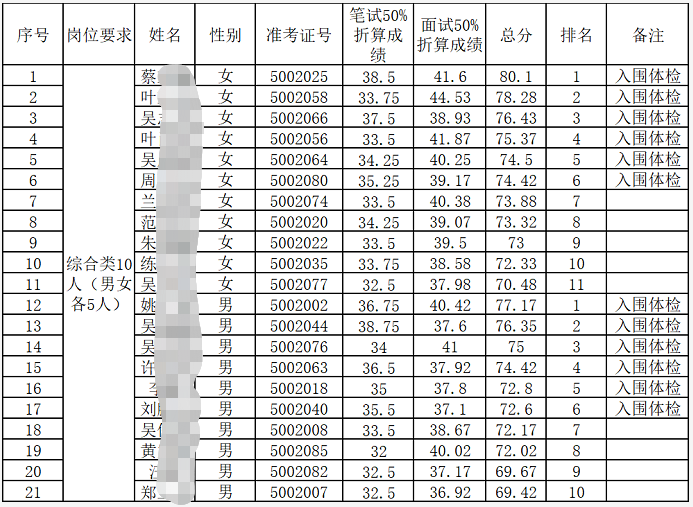 1.考生筆試、面試成績各占50%,總成績按報考崗位從高分到低分確定體檢入圍對象,入圍比例為1:1.2。