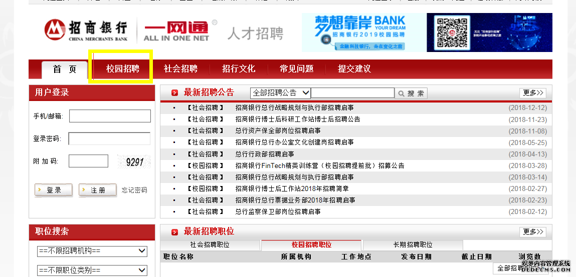 方式一:登錄招商銀行一網通主站“人才招聘”專欄,點擊“校園招聘”,注冊用戶并在線投遞簡歷。