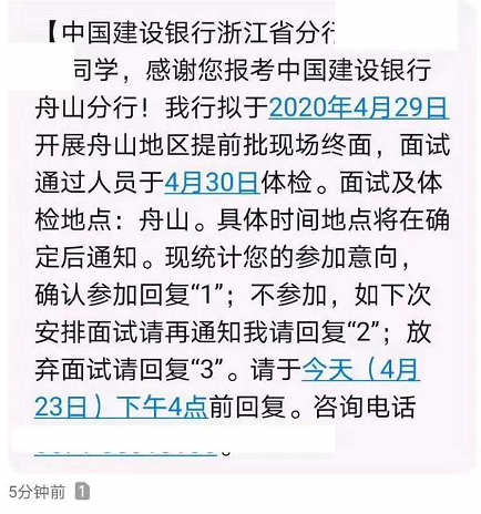 2020中國建設銀行浙江分行提前批次現場終面及體檢通知