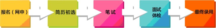 包含報名、簡歷初選、考試、面試、體檢、錄用等環節。