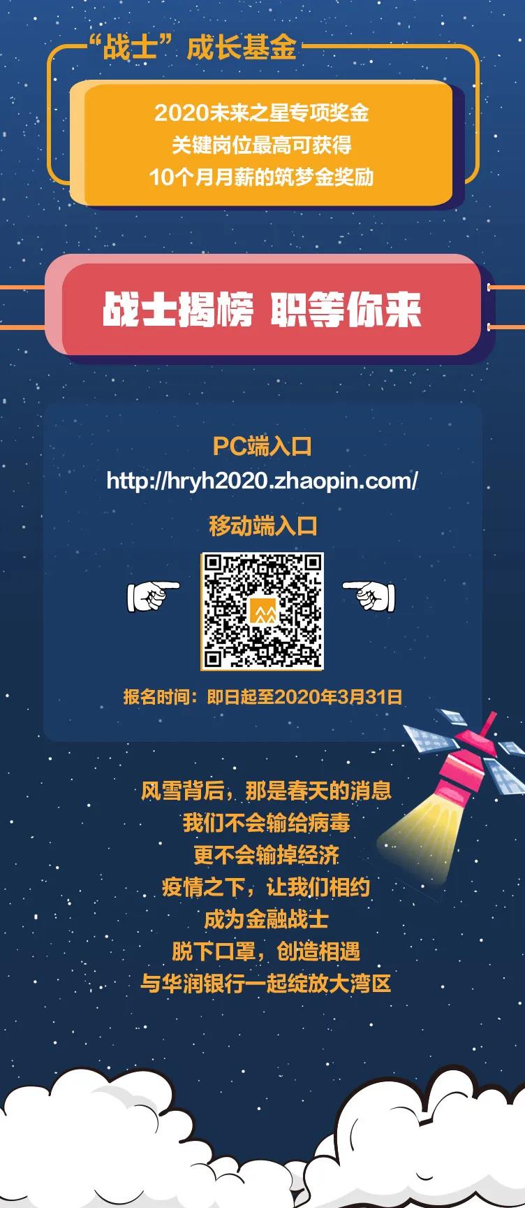 具體報名相關事項請參考官方招聘公告,詳見《2020年華潤銀行無接觸式春季校園招聘公告》。