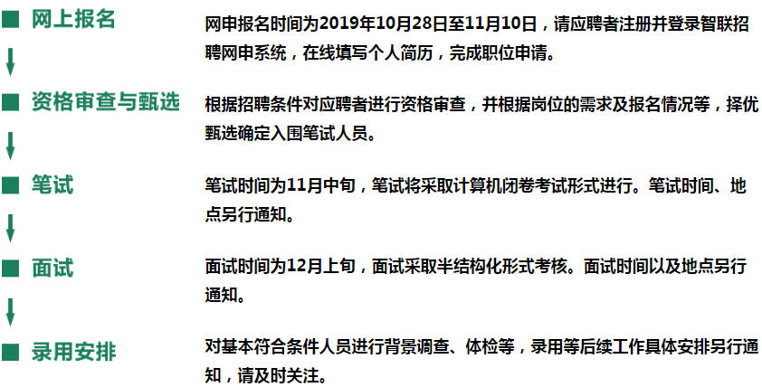 網(wǎng)申報名時間為:2019年10月28日?11月10日,請應(yīng)聘者注冊并登錄智聯(lián)招聘網(wǎng)申系統(tǒng)(http://gdyc.zhaopin.com/),在線填寫個人簡歷,完成職位申請。