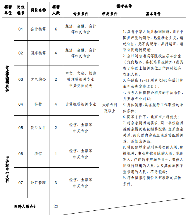 4.報考人員需符合相應的學歷條件,并要求專業對口。各崗位具體學歷和專業條件詳見《中國人民銀行營業管理部 2019 年 1業務操作崗位聘用制員工招聘崗位一覽表》; 5.身體健康,具備履行工作職責的身體條件;