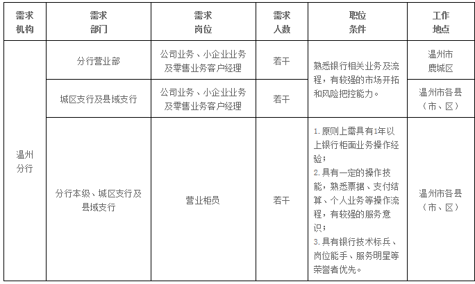 龍灣和甌海等10家支行。現因業務發展需要,面向社會誠聘金融人才,我們將堅持“以工作業績為本、以職業素養為先”的用人理念,為每位加盟員工構建良好的職業生涯發展之路,并提供業內具有競爭力的薪酬福利待遇,實現自身價值。