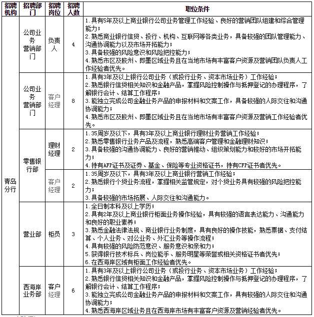 現因業務發展需要,浙商銀行青島分行面向社會誠聘金融英才,誠摯歡迎勇于挑戰、開拓創新的業內有識之士和專業英才加盟。我們將為每位加盟的員工構建良好的職業生涯發展規劃,提供業內具有競爭力的薪酬福利待遇,攜手共創美好未來!