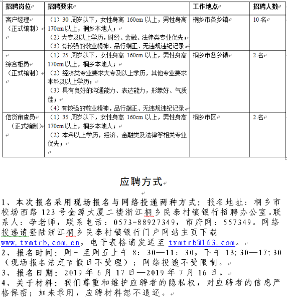 [浙江]2019浙江桐鄉民泰村鎮銀行招聘啟事