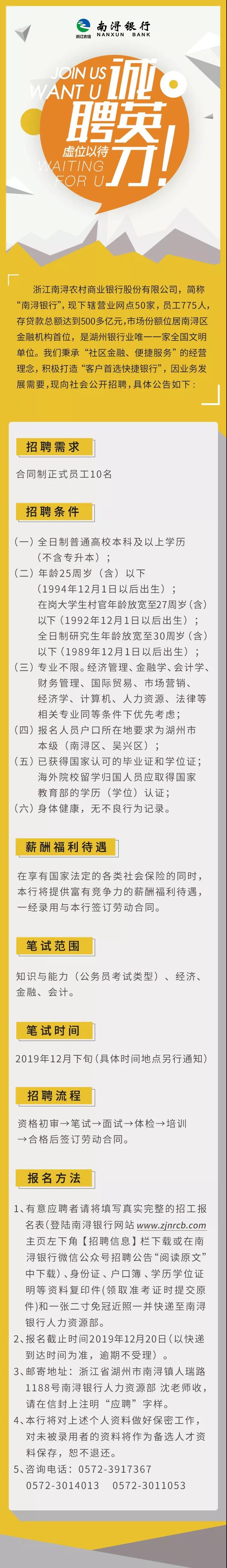 [浙江]2019年浙江南潯銀行招聘信息公告