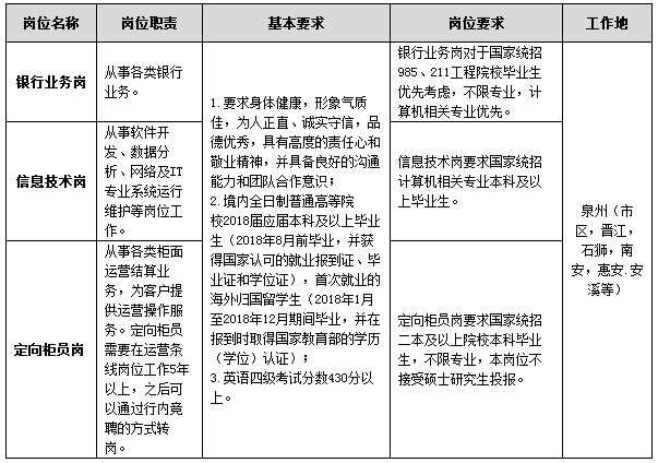 4、筆試及面試時間、地點等安排將另行通知。通過筆試的同學,在接到面試通知后,請點擊下載《招商銀行泉州分行2018年應屆畢業生應聘登記表》填寫后于面試時帶來。