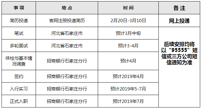現根據業務發展與人才培養的需要, 招商銀行石家莊分行面向全國高校誠邀2019年應屆畢業生加盟,具體要求如下: